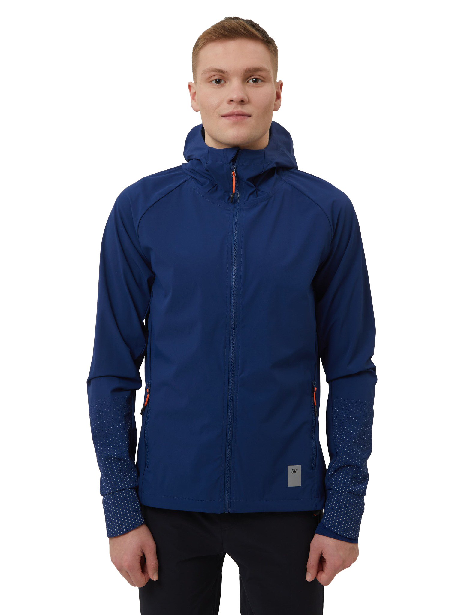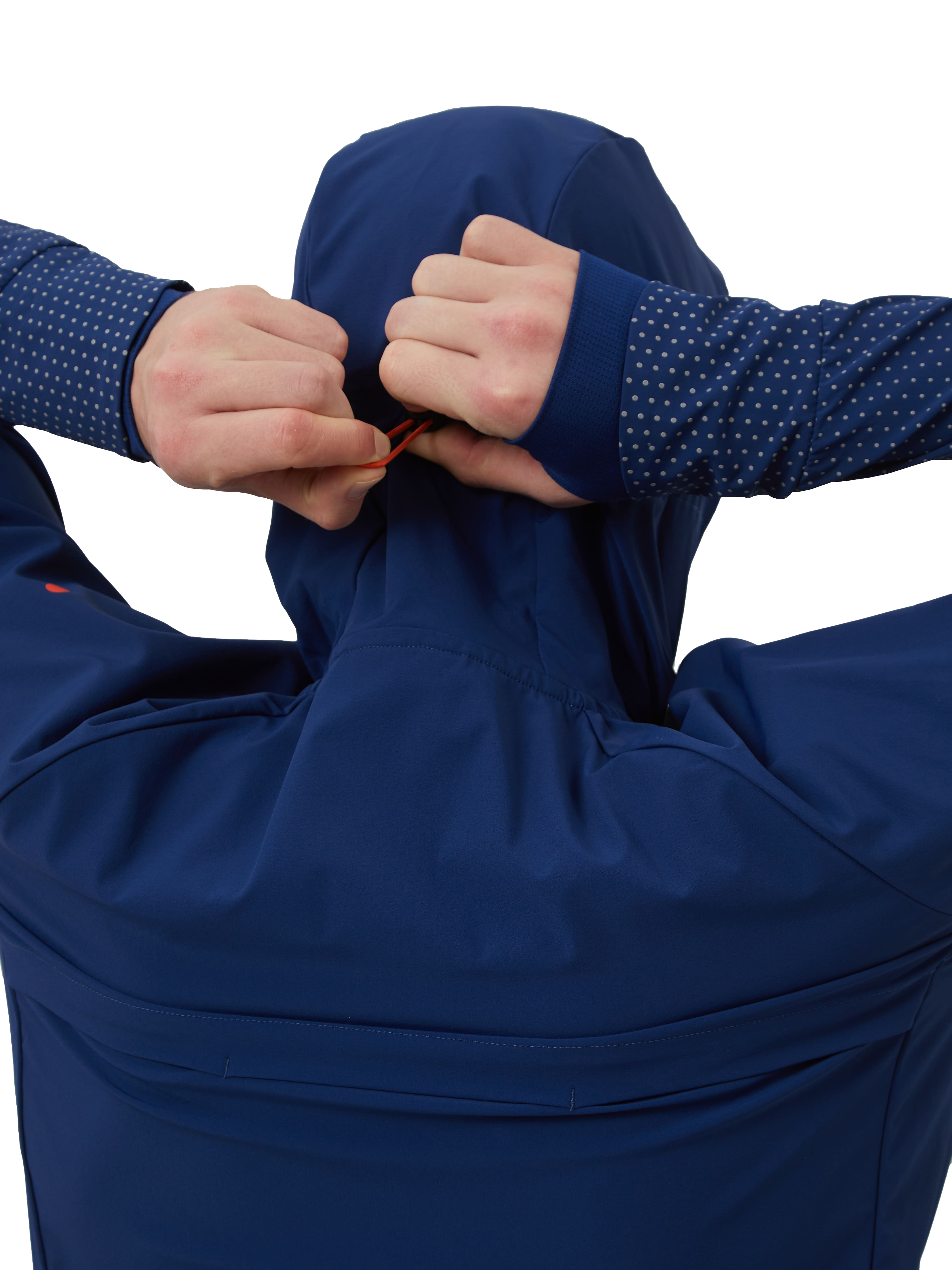 В зависимости от погоды под куртку можно надеть футболку или лонгслив. Благодаря водоотталкивающей пропитке и удобному капюшону куртка подойдёт для тренировок в дождь. Удлинённые манжеты с вырезами для больших пальцев защитят руки от холода.